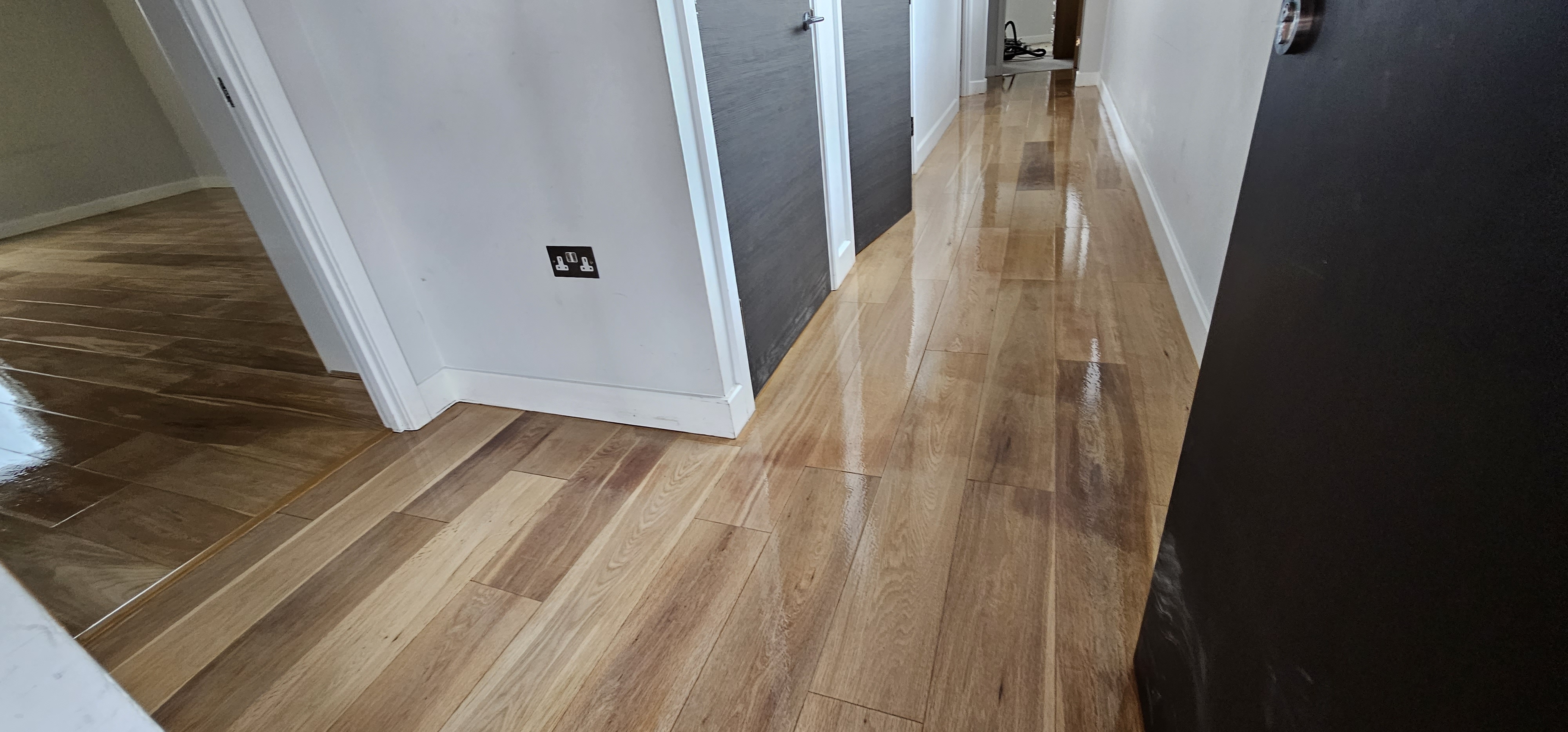 This was a engineered wood boards job in Kilburn. The floor had seen a lot of use and the old finish had started to break down in patches. We sanded it back, sorted the gaps, and applied a lacquer finish, which gives a hardwearing protective layer on top. The client wanted something that would hold up well to daily use.